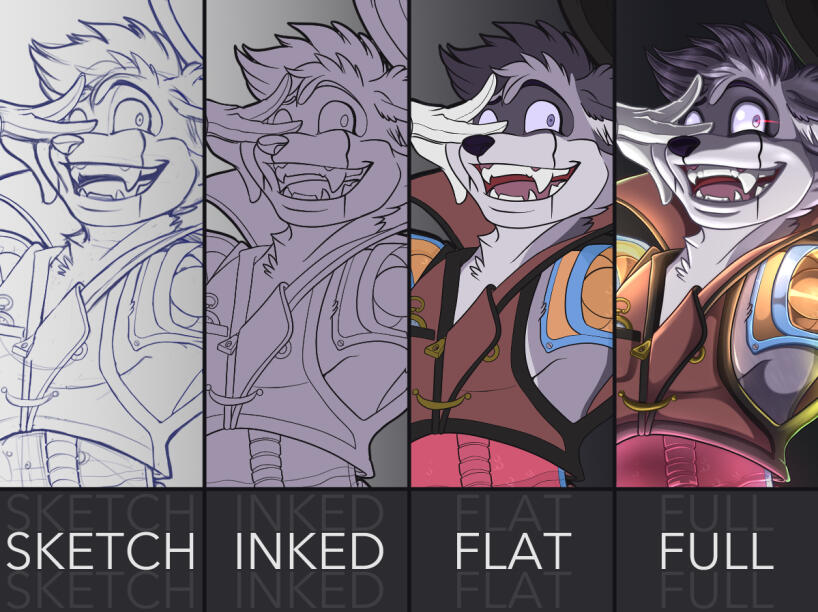 | Drawing | Sketch | Inked | Flat Colour | Full Colour |
