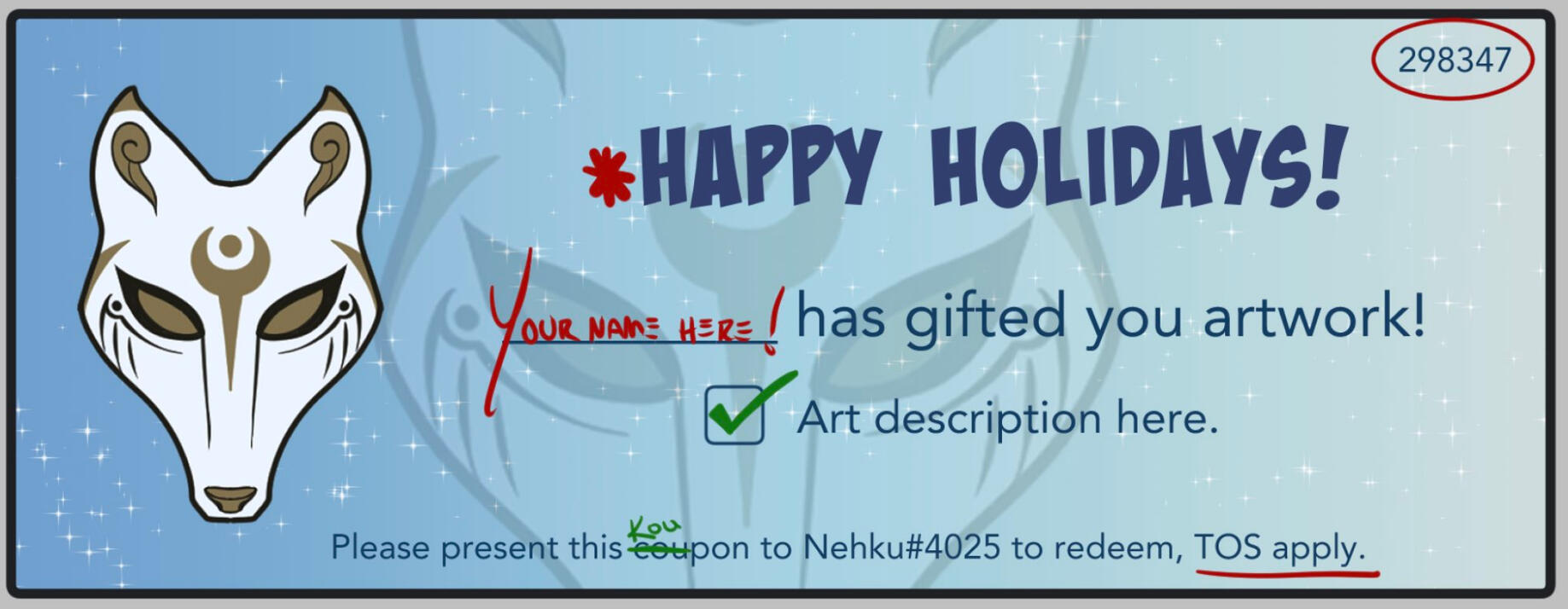 How It Works!► Each gift image ('Koupon') is equipped with a unique tracking number up top to assure no one can steal and use the Koupon. When you purchase, I will be asking for the name of the gift receiver to assure records match.► The title can be changed to whichever celebration you would prefer. Birthdays, Valentines, Anniversaries, Friendiversaries, etc! The background colour can also be changed.► If you want to remain a Secret Santa or Anonymous in your gift-giving, I will be happy to deliver the Koupon for you and put 'anonymous'.► I am currently only offering Headshots and Busts for these. This may change in the future. These are at a small discount because they are being gifted to someone else.► I will be sending you an invoice via PayPal for what you want. You don't have to tell me the characters or designs, just that you want to purchase x amount of characters and in what style (sketch, ink, etc.) Your gift receiver will provide their references and wants.► You cannot purchase these with intent for yourself, your characters, etc. These are meant to be a gift to others, which means your OCs exempt from being qualified for being part of the Koupon you gifted. If you purchased a pair, keep in mind it needs to be for someone else and they cannot choose you as their second.