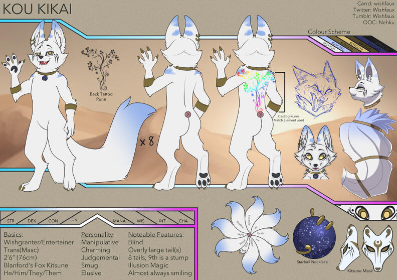 Who am I?► I am Nehku, or V! I am a mostly self-taught artist based in the United States. I am a full-time freelance artist who deals in character concept design and works heavily with clients from games, particularly MMOs such as FFXIV, World of Warcraft, and tabletops like D&D! I enjoy snipe drawing my friends and gaming! I have two cats, Aru and Sifa, who you will likely hear me talking to during any stream I happen to do.Who is V?► Veikko (or V as he's lovingly called) is my fursona, a skull-faced Aardwolf. I also use him as my VTuber avatar.Who is Kou?► Kou Kikai is my little kitsune Mascot. He has multiple forms but is usually portrayed as a white fox-like creature.